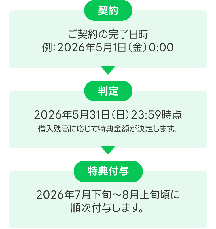 ※キャンペーン期間中に4万円以上お借入いただいた場合でも、2026年5月31日(日)23:59時点で借入残高が4万円未満の方は特典付与の対象外となります。