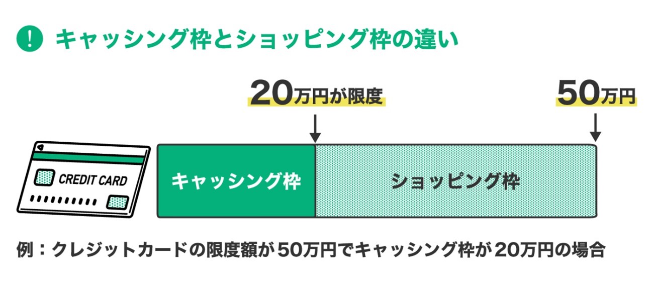 たとえば、クレジットカードの限度額(ショッピング枠)が50万円でキャッシング枠が20万円の場合、借りられる金額は20万円までとなります。