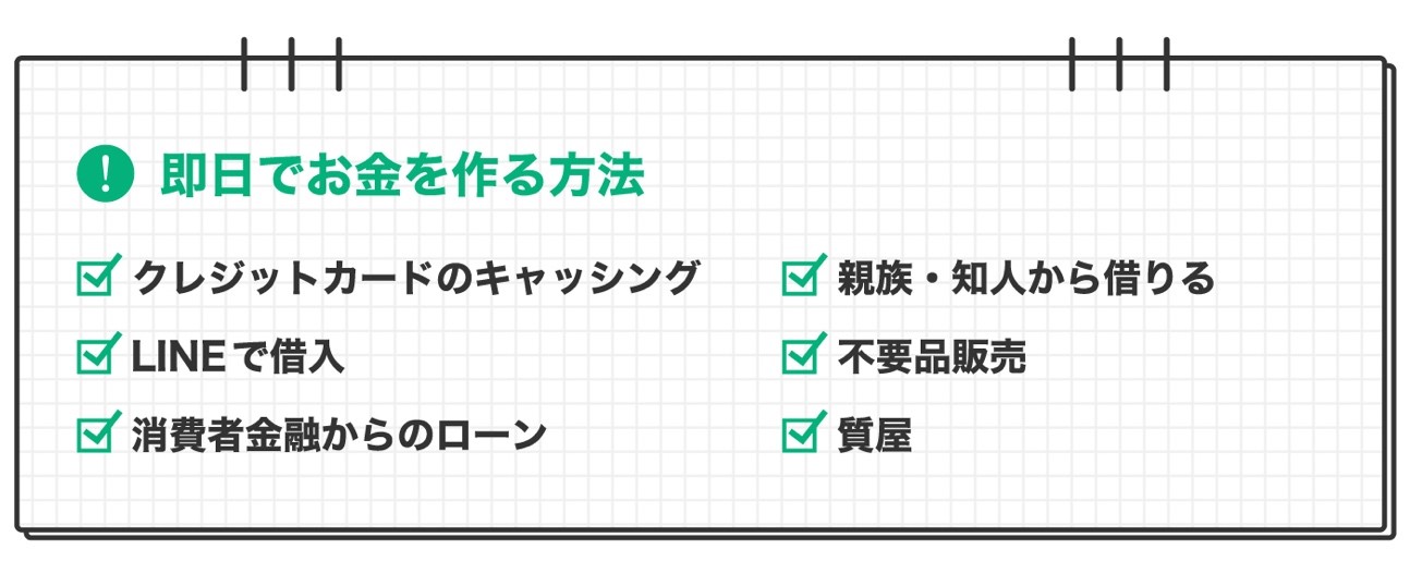 お金を準備する方法はいくつかありますが、即日で準備できる可能性が高いのは次の6つです。