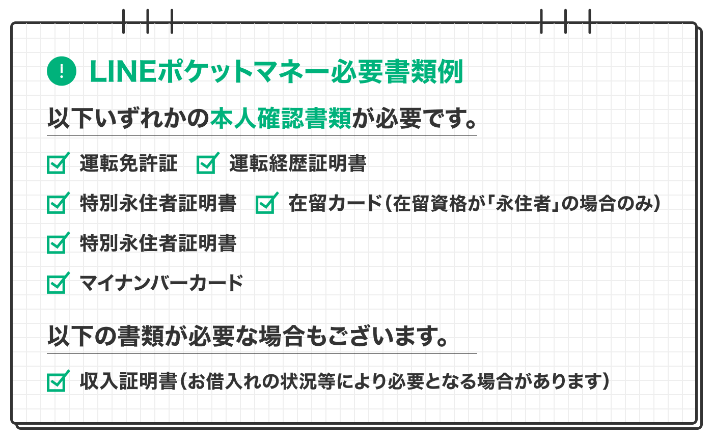 LINEポケットマネーの申込にあたっては、以下のようなものが必要です。