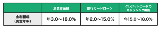 実際にお金を借りる際に適用される金利は、キャッシングの手段によって異なります。消費者金融、銀行カードローン、クレジットカードのキャッシング機能の金利の相場はこちらです。