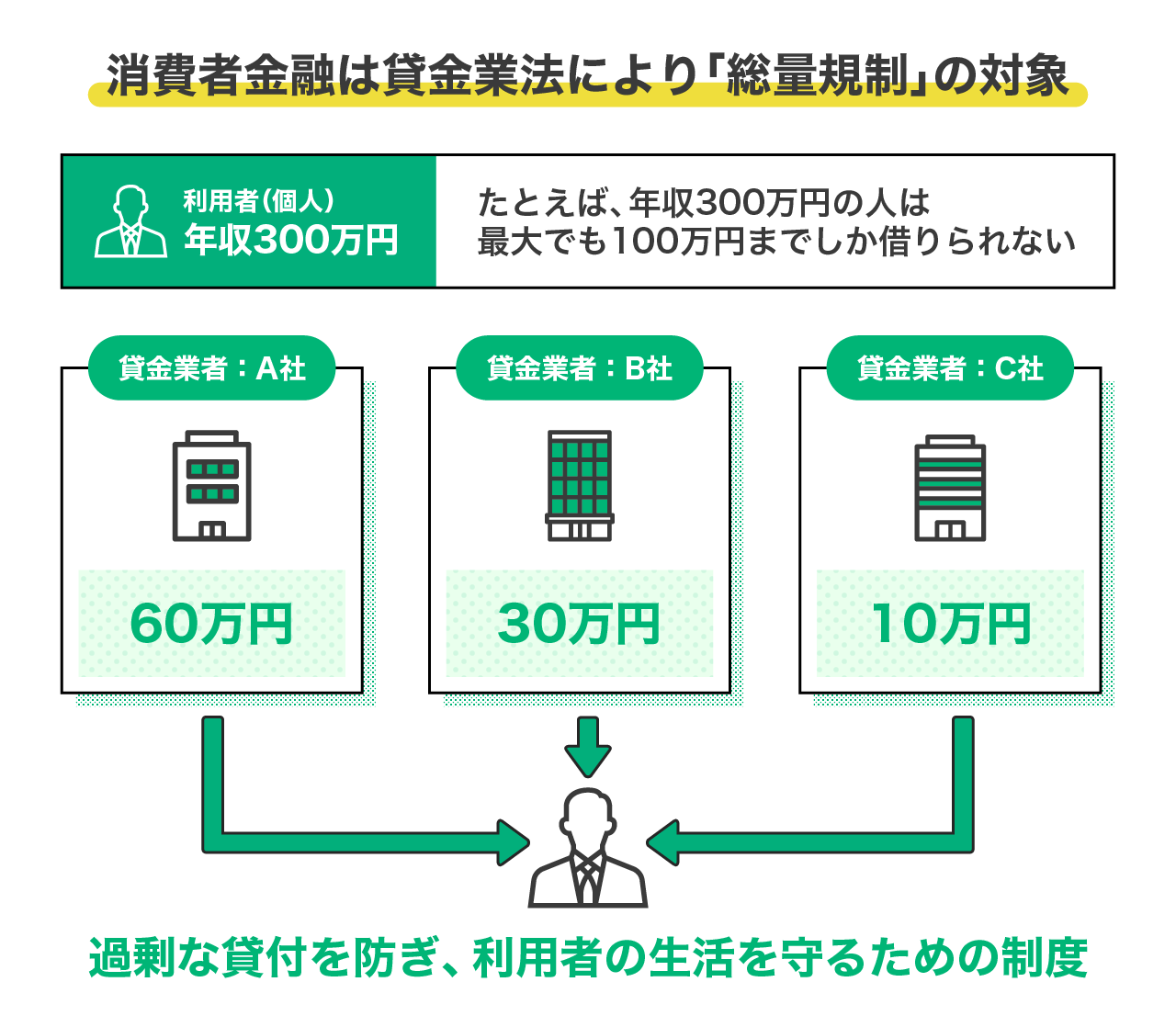 消費者金融は貸金業法により「総量規制」の対象となっており、借入可能な金額は原則として年収の3分の1までに制限されています。たとえば、年収300万円の人は最大でも100万円までしか借りられないという仕組みです。