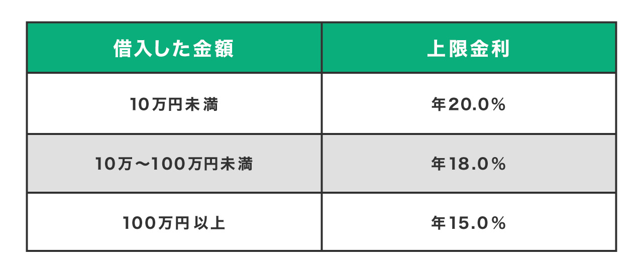お金の貸し借りにおける金利の上限などを定めた法律で、この法律で定められた金利の上限を超えて貸し付けることを禁止しています。また、その金利の上限は貸付金額によって異なり、最大で年20%となっています。(下図参照)