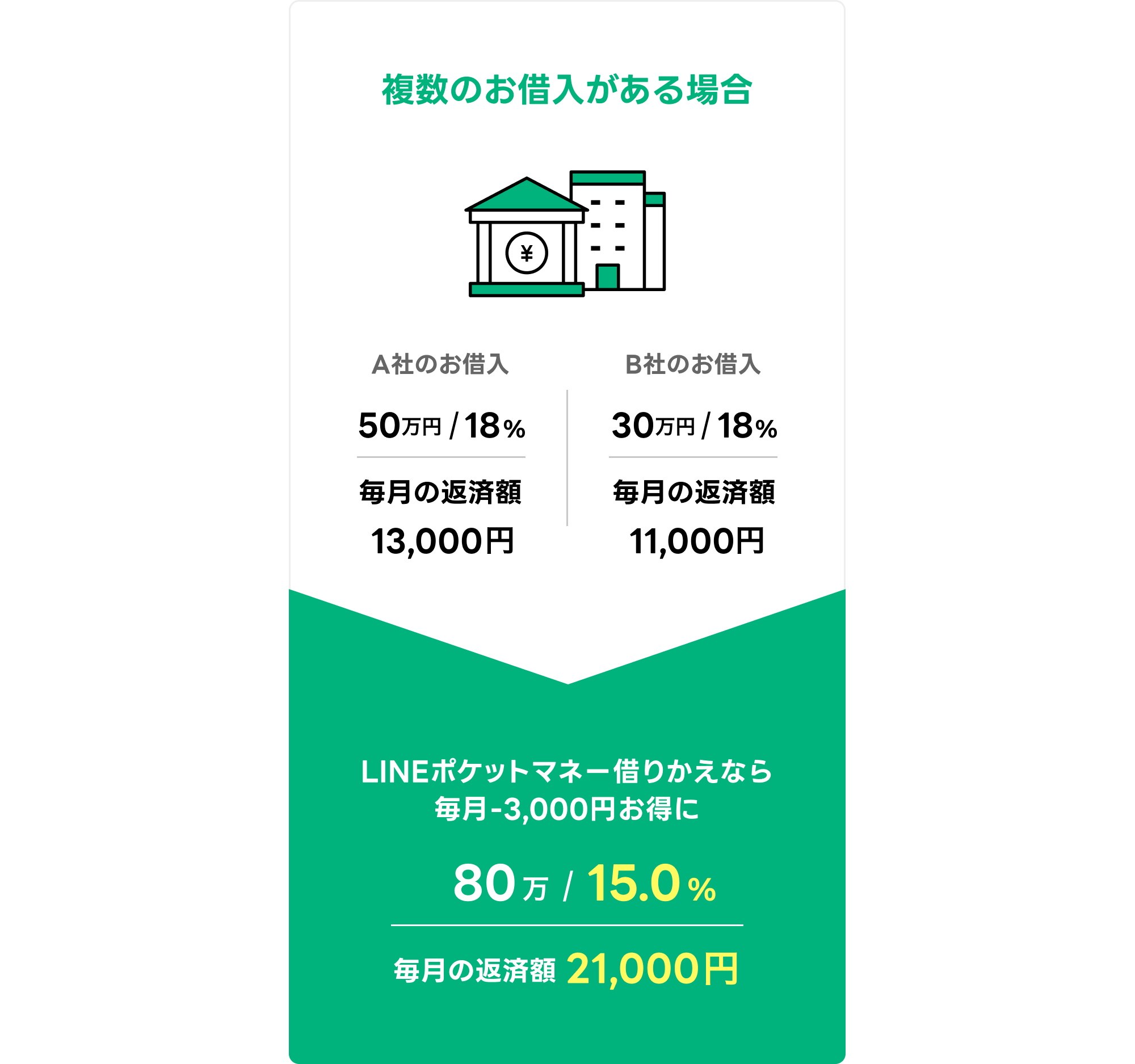毎月の返済額:21,000円(A社+B社の時は13,000円+11,000円=24,000円)