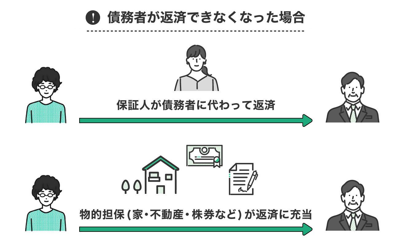 そもそも、担保とは、返済が困難になった場合の保証として債務者(お金を借りる側)が差し出すもののことです。債務者(お金を借りる側)が返済できなくなった場合、債権者(お金を貸す側)は担保によって貸し付けたお金を回収します。担保には人的担保と物的担保があります。
