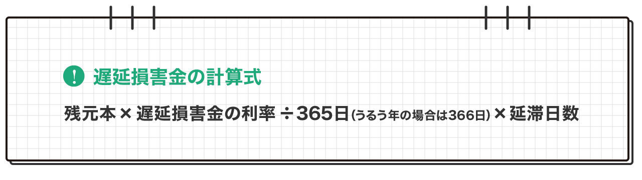 カードローンの返済が滞ると、返済日から遅れた日数に対して遅延損害金が発生します。遅延損害金は、返済の遅延に伴って発生する損害金で、一般的に通常より高い金利が適用されます。遅延損害金は以下の式で計算されます。
