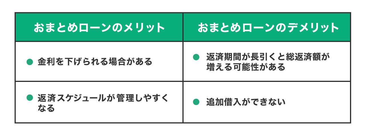 複数のローン会社からの借入などで返済が困難になった場合は「おまとめローン」を利用することで、借入を1つにまとめ、返済の負担を軽減することができます。おまとめローンの主なメリット・デメリットを確認します。