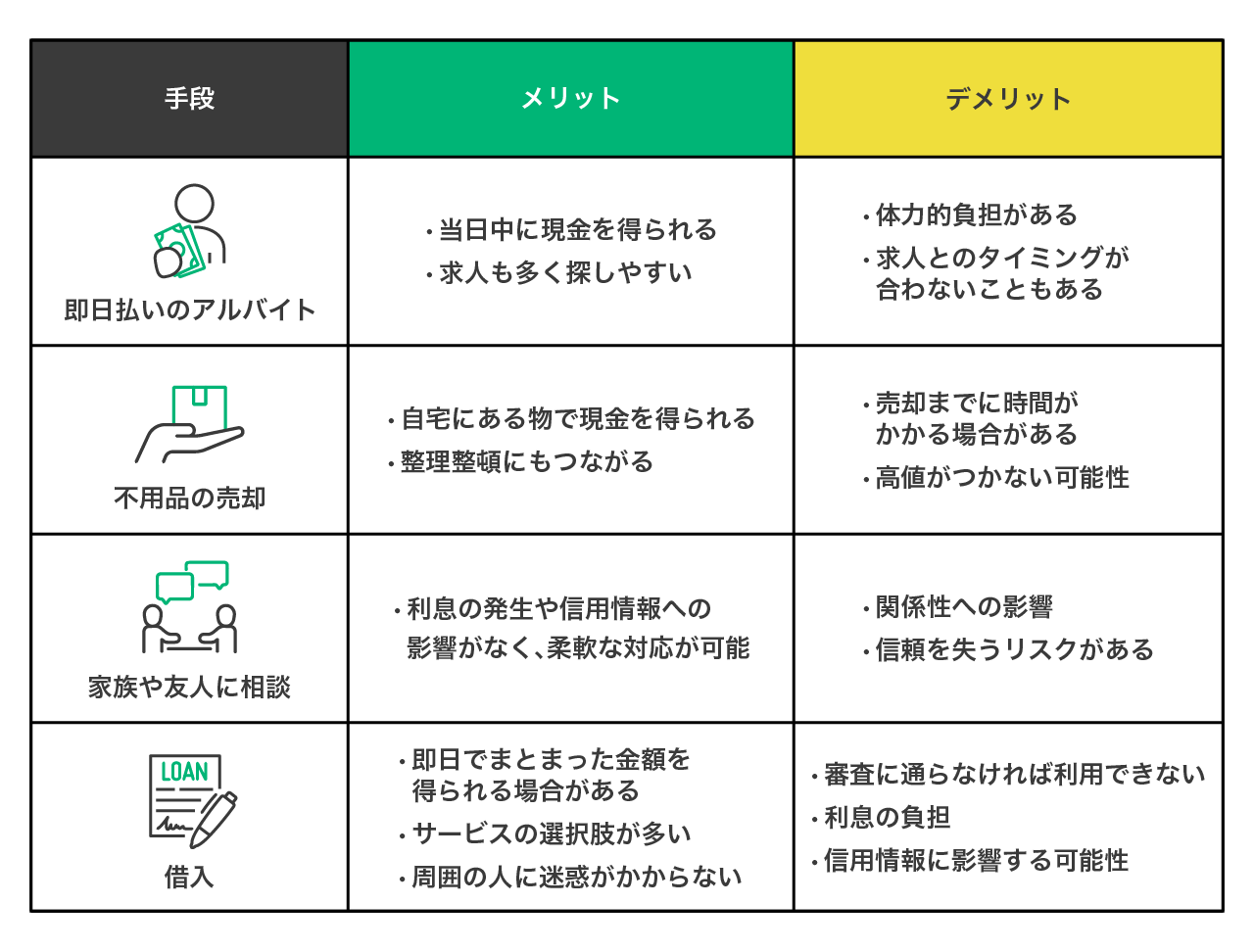 給料日までお金が足りないときには、すぐに実践できる対処法を知っておくことが大切です。具体的には、即日払いのアルバイトや不用品の売却、信頼できる人への相談といった方法が挙げられます。どの方法にもメリットとデメリットがあるため、今自分にできることを十分に考えながら、対処法を探っていきましょう。