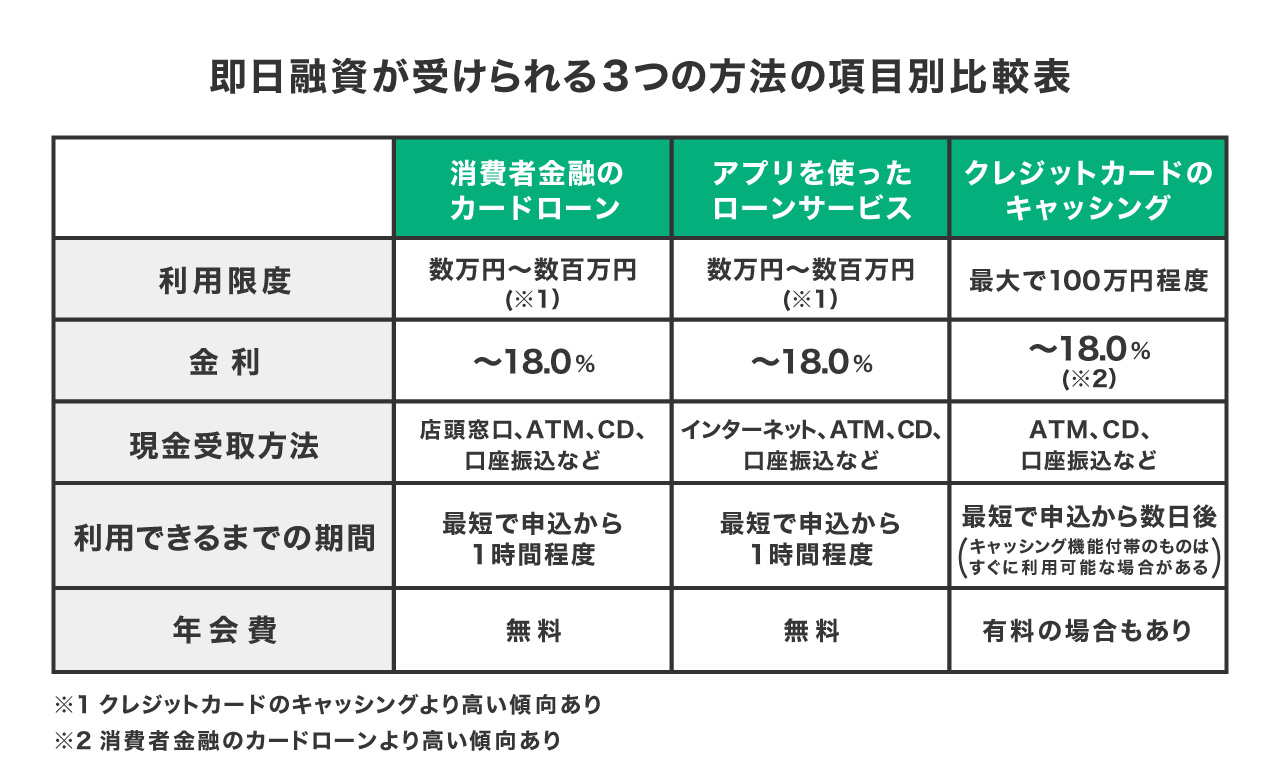 カードローン以外で即日融資を受けることができる方法について、主なものを確認してみましょう。