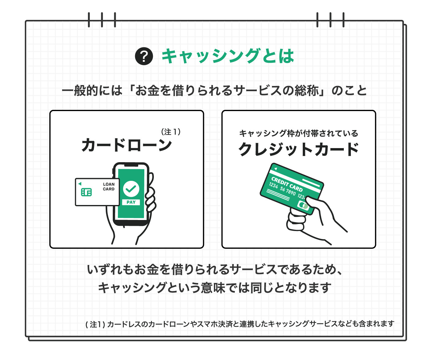 キャッシングとは、一般的にお金を借りられるサービスの総称のことで、クレジットカードの付帯機能を使ったキャッシングやカードローンなどがあります。キャッシングというと、クレジットカードの付帯機能を使った借入を思い浮かべる方も多いかと思いますが、今回は、お金を借りられるサービスの総称としてのキャッシングについて解説します。