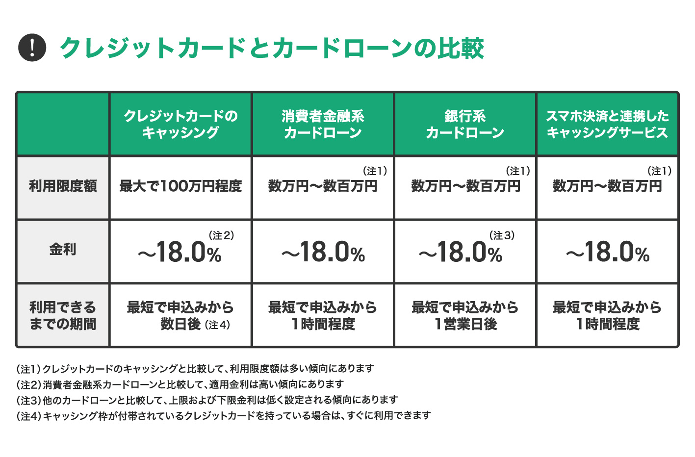 キャッシング枠が付帯されているクレジットカードを利用したキャッシングの方法です。クレジットカードの審査には数日から数週間かかる場合もありますが、キャッシング枠が付帯されているクレジットカードを持っている場合は、キャッシング枠内であれば即日お金を借りることも可能です。消費者金融系のカードローンと比較して、利用限度額は少ない傾向にあり、適用される金利は高い場合もあります。