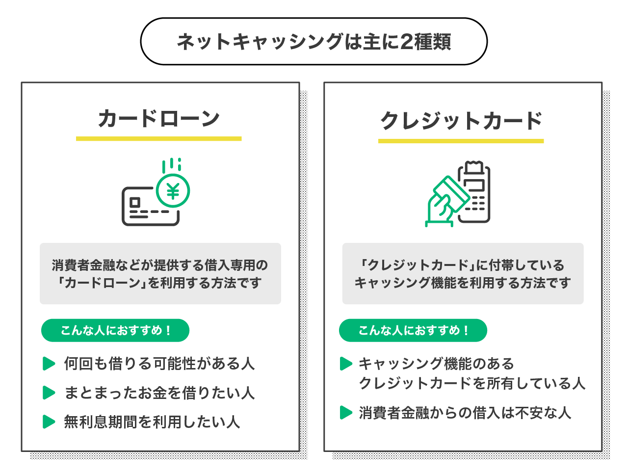 ネットキャッシングを利用するには、大きく分けて2つの方法があります。1つは、「カードローン」を利用する方法です。もう1つは、「クレジットカード」に付帯しているキャッシング機能を利用する方法です。