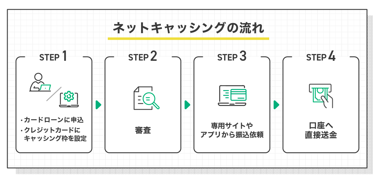 すでにお持ちのクレジットカードに「キャッシング枠」が設定されていれば、改めて申込をしなくてもすぐにネットキャッシングを利用できます。カード会社の会員専用サイトにログインし、キャッシングサービスや振込融資のメニューから手続きを行うだけで、登録している銀行口座へお金を振り込んでもらえます。