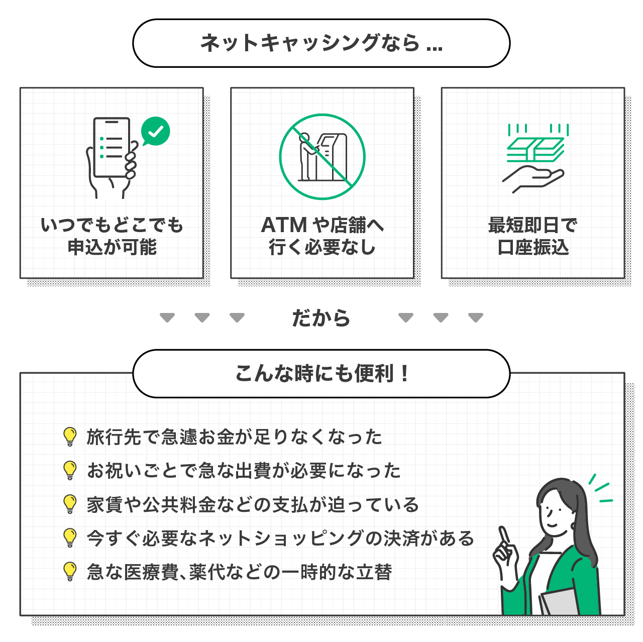 急な出費に対応できるスピード感も、ネットキャッシングの大きなメリットです。