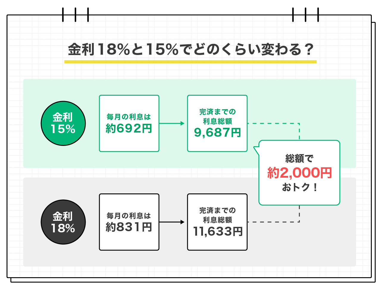 毎月同じ金額を返済しても、金利が3%違うだけで利息総額に約2,000円の差が出ることが分かります。返済期間はどちらも14カ月ですが、最終回の返済額が銀行の方が少なくなるため、総支払額が変わってきます。