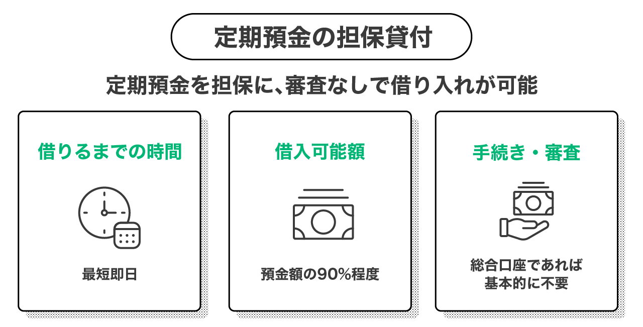 もし銀行の総合口座に定期預金があれば、それを担保にして審査なしでお金を借りる「定期預金担保貸付」を利用できる可能性があります。これは、普通預金の残高が不足した際に、定期預金額の9割程度を上限として自動的に融資(当座貸越)してくれるサービスです。