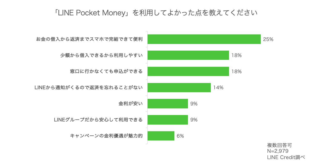 こちらについては、「お金の借入から返済までスマホで完結できて便利」が25%、「少額から借入できるから利用しやすい」「窓口に行かなくても申込ができる」が同じく18%、「LINEから通知がくるので返済を忘れることがない」が14%という結果でした。