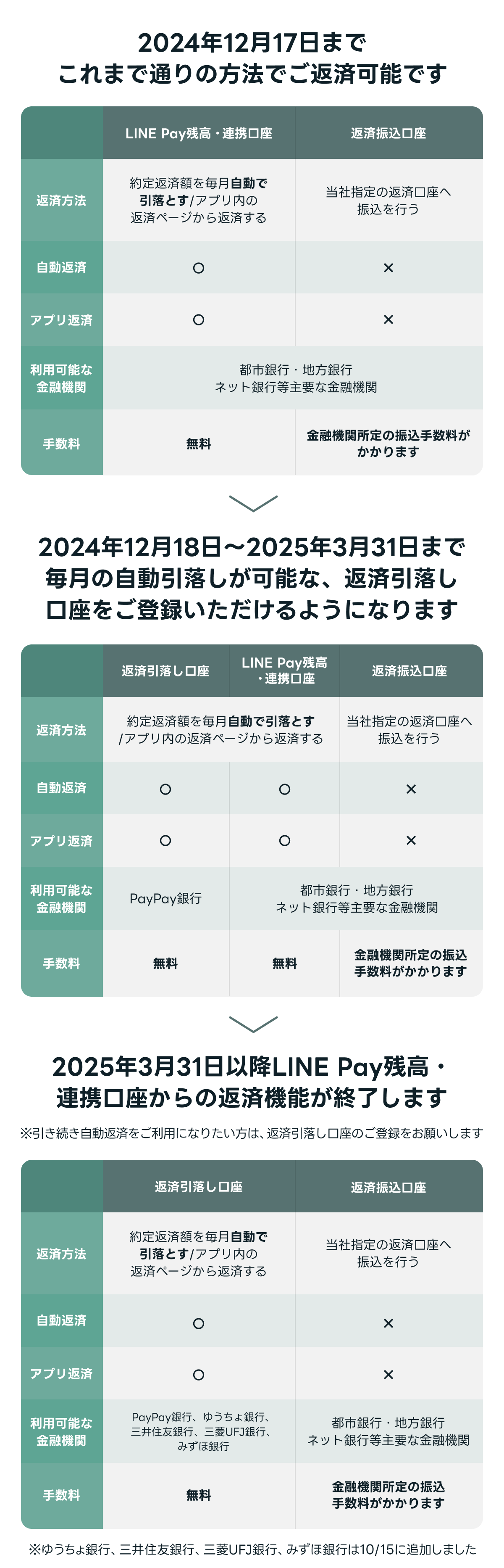 A. 2025年3月31日までは、引き 続きLINE Pay残高・連携口座からのご返済が可能です。