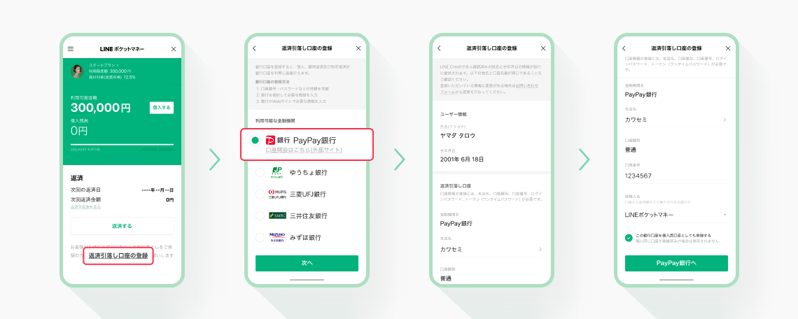 引き続き自動引き落としやLINEアプリからの返済をご利用いただきたい場合は、返済引落し口座のご登録をお願いいたします。