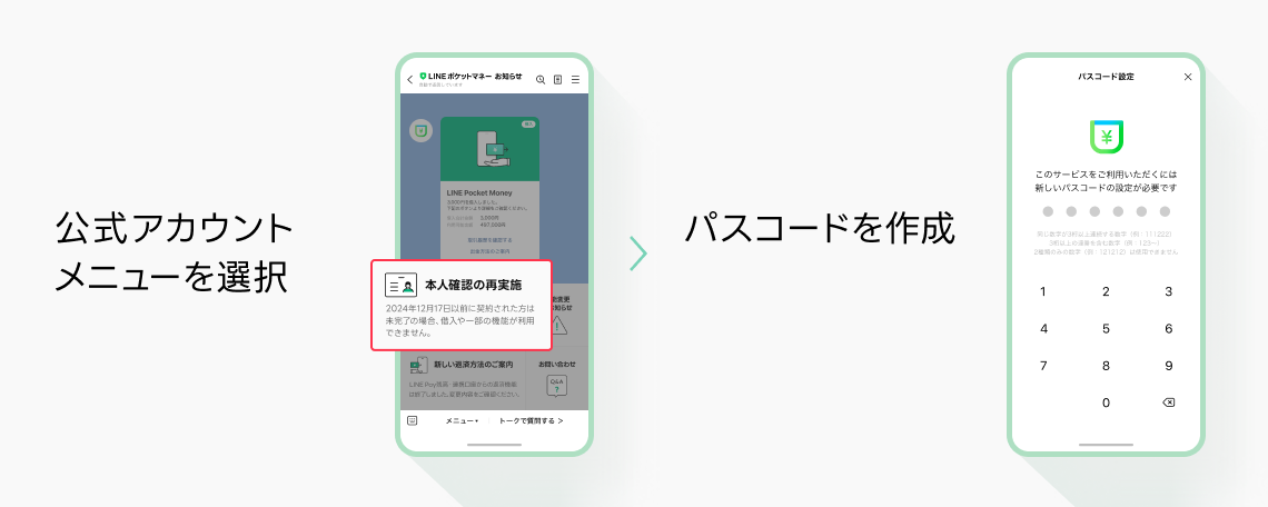 「LINE Pay スマホでかんたん本人確認」にてご本人様情報をご提出いただいていますが、サービスを引き続きご利用いただくため、対象のお客さまはLINEポケットマネー専用となる新規のパスコードの作成と、再度の本人確認を実施してください。