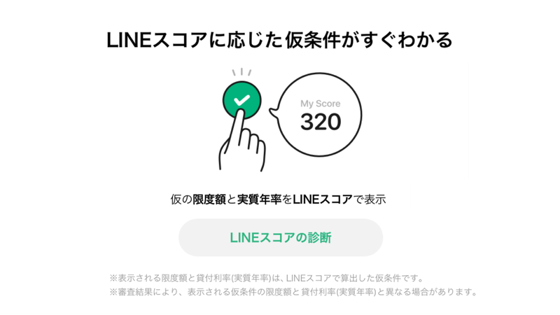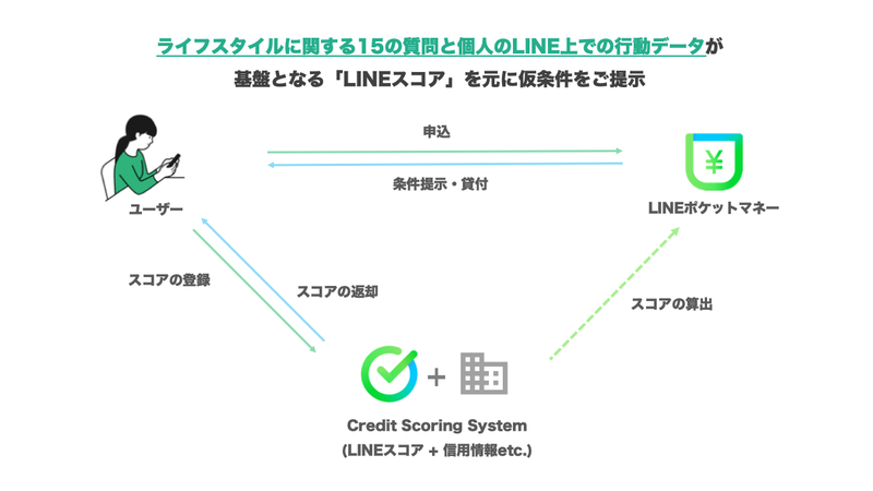 ライフスタイルに関する15の質問とLINE上の行動傾向データを元にLINEスコアを算出し、利用限度額、貸付条件(実質年率)を決定