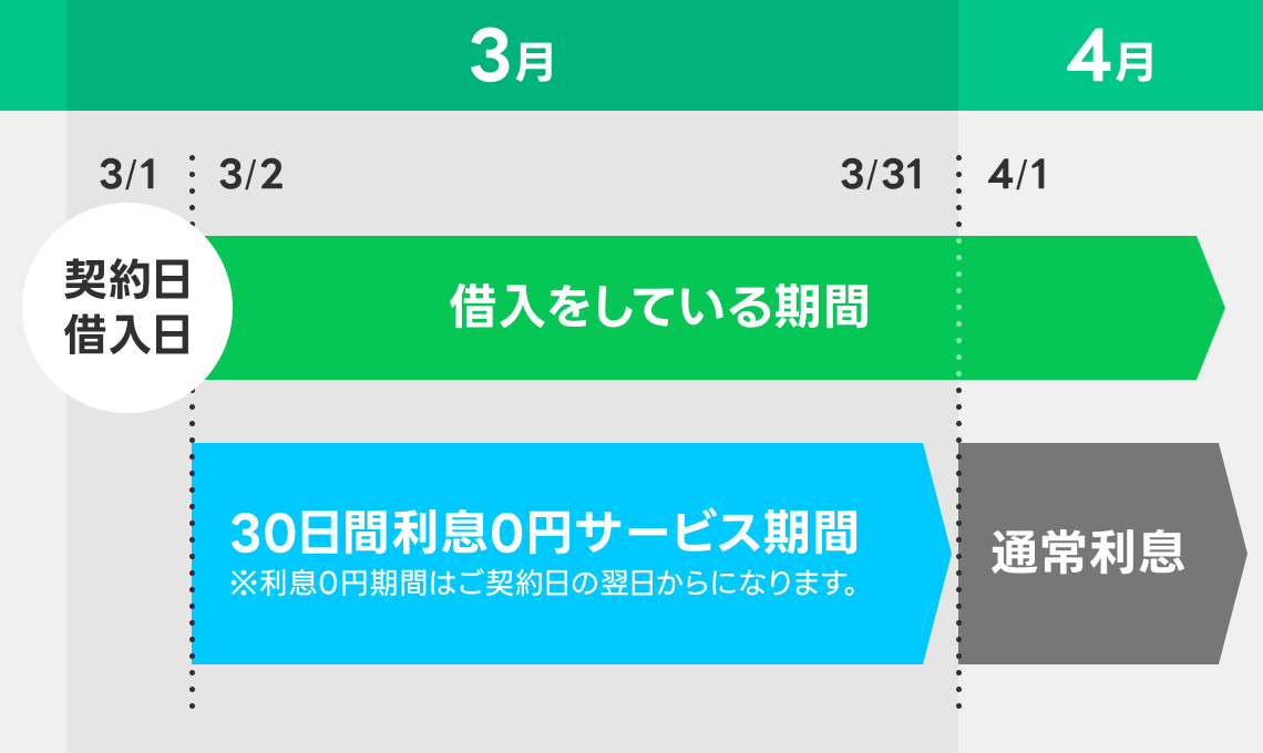 ・30日間利息0円サービス期間はご契約日の翌日から30日間となります。