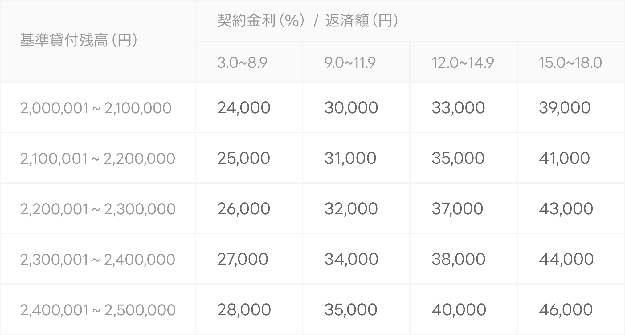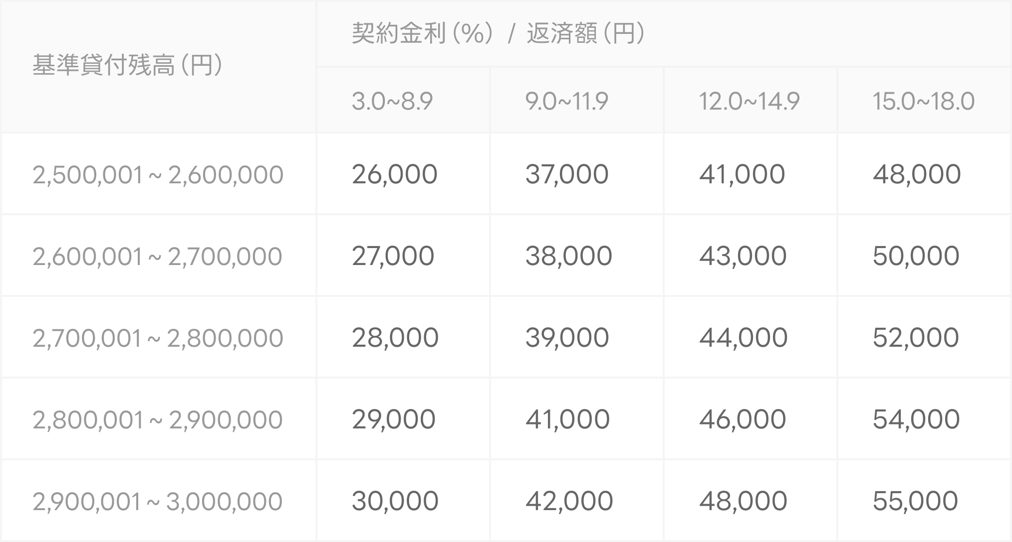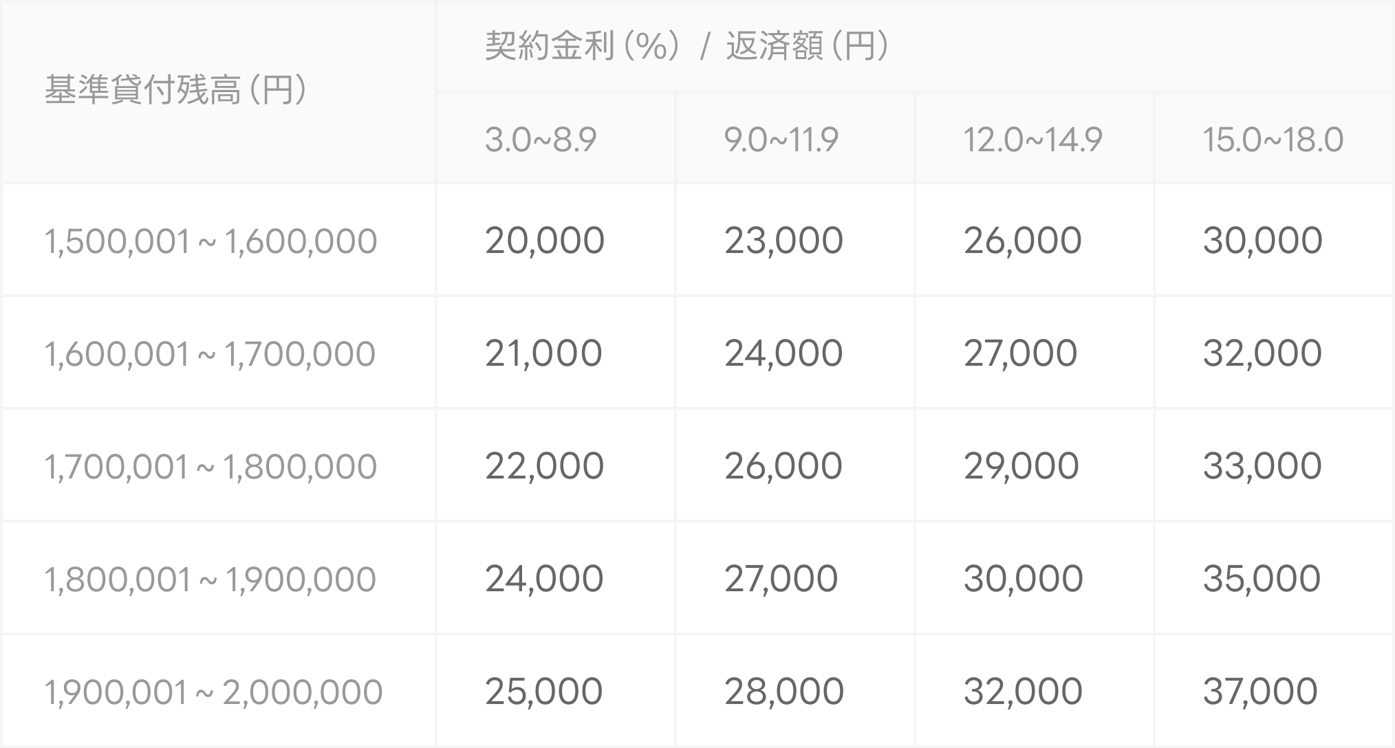 借入後残高ごとの返済金額